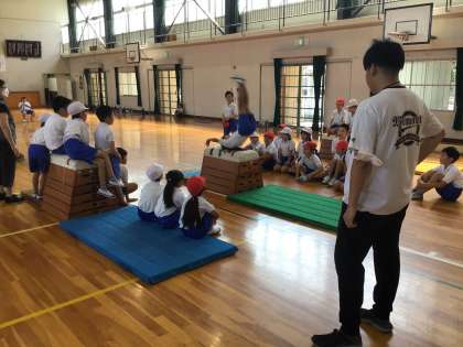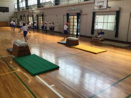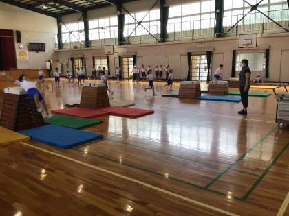 3の1 体育です。 台上前転の勉強です。 お手本を見て,コツが掴めたようです。