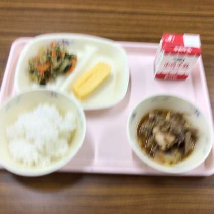 今日の給食です。 牛乳パック,赤くなったよ。