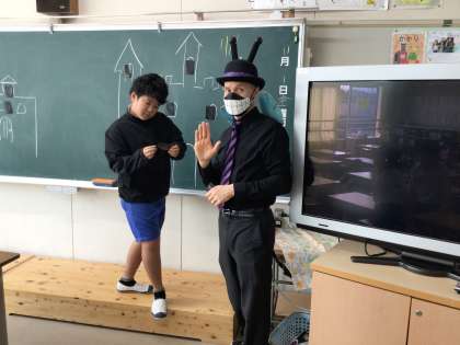 2の1 おっと,バイキンマン登場。 ALTの ブライアン先生だよ。