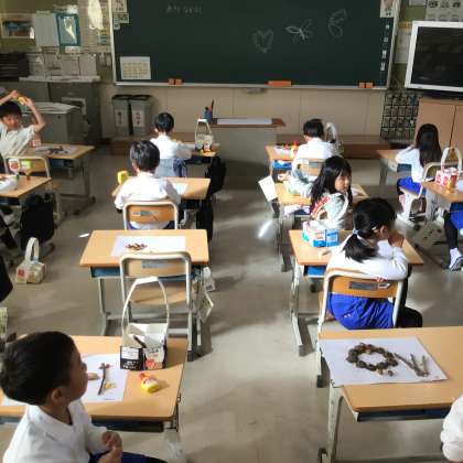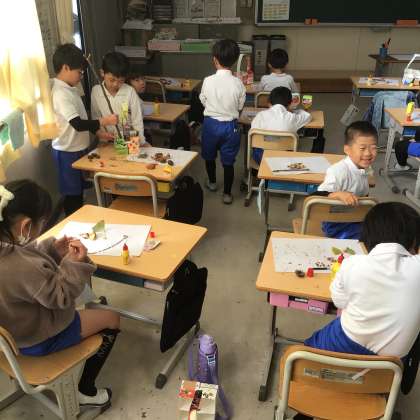 1の2 生活です。 秋とあそぼう! 見つけた秋で遊んでるよ。