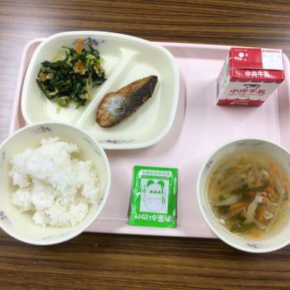 今日の給食です。 お魚はサワラです。