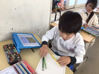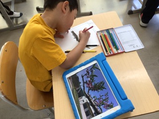 2年生 春をかこう(2組 4月17日) 公開日 2025/04/17 更新日 2025/04/17 各学年から 学習用タブレットで、描きたい春の景色を1枚だけ写真に撮ってきました。写真をじっくり見ながら色鉛筆で春を描いています。写真も絵も、両方とも素敵です。 2年