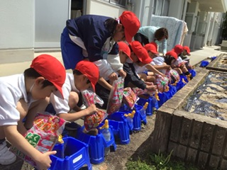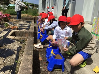 オクラやトマトなど、自分が選んだ夏野菜を育てます。今日はプランターに土を入れて、苗を植える準備をしました。