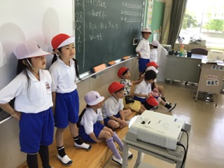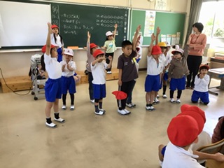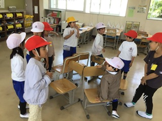 算数の授業です。椅子取りゲームをしながら、かずや数字について学んでいます。