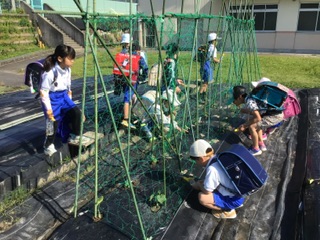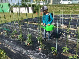 朝、たくさんの人が畑やプランターに水やりをしています。元気に育つとよいですね。