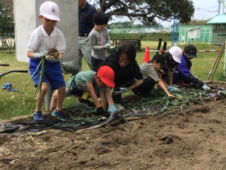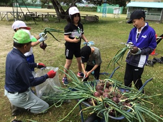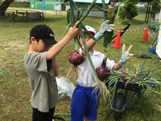 学級園の玉ねぎを収穫しました。とても大きく育っていて、掘り出すのが大変でした。一つ一つ丁寧に収穫しています。