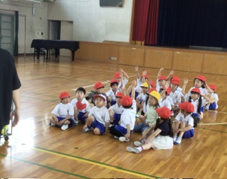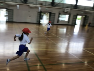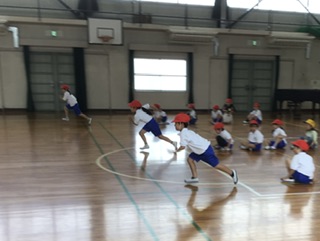 体育の時間です。チームに分かれてリレーをしたり、ボールを使った運動をしたりしています。