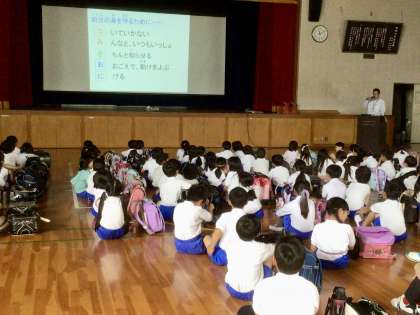 2、3、4年生 子どもの防犯教室(5月15日) 公開日 2025/05/16 更新日 2025/05/16 各学年から 警察署の方達を講師に迎え、子どもの防犯教室を開催しました。まずは、自分の身を守るための「つみきおに」について確認しました。また、もし不審者に出会った時は、大きな声で助けを呼んだり、防犯ブザーを鳴らしたりするなど、どう対応すればよいのかも学びました。 2年 3年 4年 特別支援学級