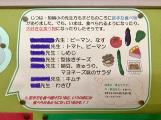 保健室前にある、食育コーナーの掲示が変わりました。テーマは「すききらいなく食べよう」です。掲示を見ると、どの食べ物がみんなの体の中でどんな働きをしているのかを知ることができます。加納小学校の先生たちが、小さい頃苦手だった食べ物も分かってしまいます。時間がある時に、ぜひ見に行ってみてください。