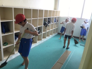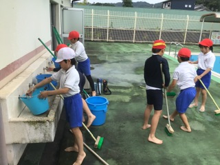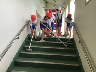 9日のプール開きに向けて、今日は高学年がプール掃除に取り組みました。まずは4年生。更衣室やトイレ、プールへ向かう階段などが担当です。1年ぶりの掃除でたくさんの汚れがありますが、みんな頑張っています。