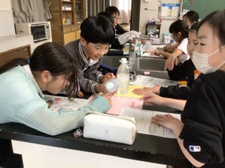 ティッシュとトイレットペーパー、どちらが水に溶けやすいかの実験も行いました。結果は、4年生に聞いてください。