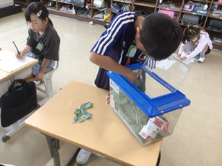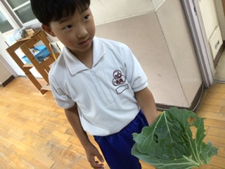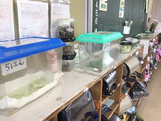 教室で飼っているモンシロチョウの幼虫に、毎日新鮮なキャベツをご飯としてあげています。「幼虫が無事にモンシロチョウになれますように」と願いを込めて世話をしています。手に持っているキャベツに、たくさんの幼虫がいるのが見えるでしょうか。