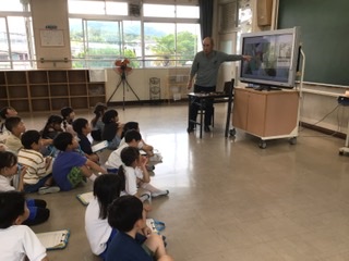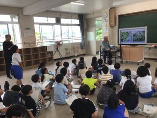生活科で育てている夏野菜の大きく育てるコツを、公務手の野菜名人河田さんに教えてもらいました。写真を見ながら、わかりやすく教えていただき、早速来週に肥料を撒くことになりました。すくすく育つ野菜に興味津々な子ども達です。