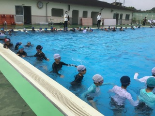 5、6年 Uitemate講習会(7月4日) 公開日 2025/07/04 更新日 2025/07/04 各学年から 消防本部救急救命士の方を講師に招き、「Uitemate講習会」を行いました。川や海に落ちてしまった時、身の回りのものを使って浮き、助けを待つことが大切です。今回はペットボトルや靴、雑誌などで浮く練習をしました。事故に遭わないのが1番ですが、もしもの時は、この講習会を思い出して慌てずに対応できるとよいですね。 5年 6年 特別支援学級