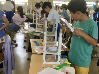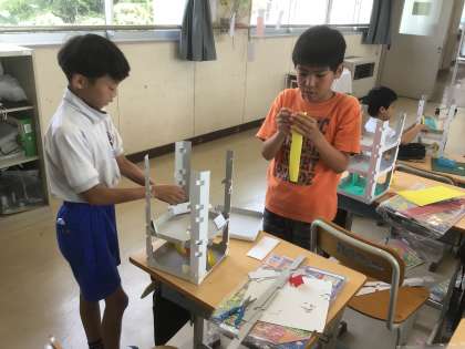 ビー玉が転がる仕組みを使って、タワー型のおもちゃを作ります。通路や滑り台を作ったり、穴を開けたり、たくさんの工夫ができそうです。どんな作品になるのでしょうか。