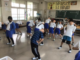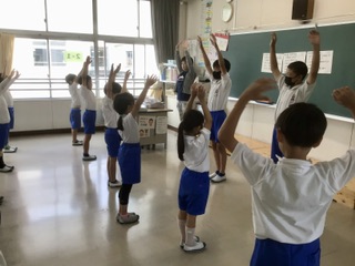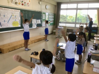 7日から17日まで、朝、ラジオ体操を行っています。今は暑さが厳しいので、外遊びをすることができません。それでも元気に体を動かす機会をと、体育委員が考えました。冷房の効いた涼しい教室で、みんな、しっかりと体操をしています。