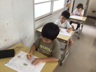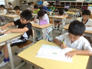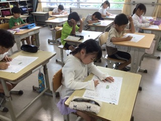 国語のテストに取り組んでいます。みんな真剣な表情です。