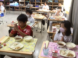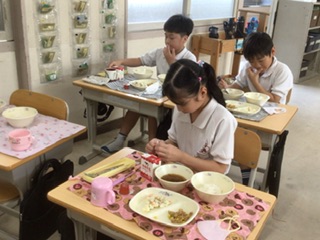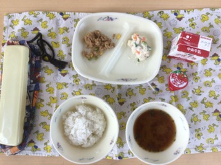 今日の給食は防災献立です。備蓄用味噌汁とツナそぼろ丼。 おいしくいただきます。