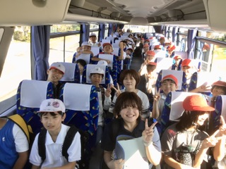 5年生、元気いっぱい自然観察の森へ出発です。たくさんの発見がありますように。
