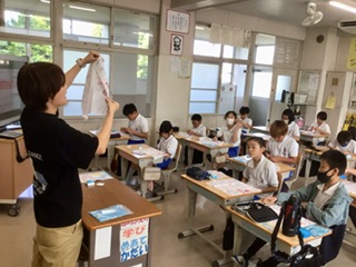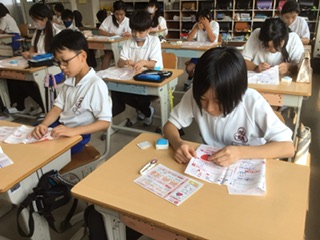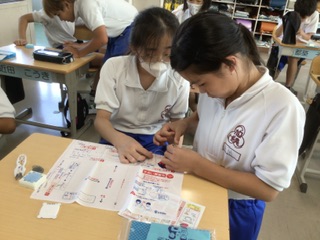 裁縫道具を使って、縫い物に挑戦です。針に糸を通すのも、玉結びするのもなかなか上手くできません。コツを掴むまでが大変です。