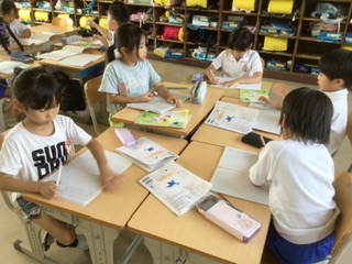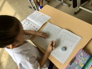 教室の中のものや自分の知っていることで、カタカナであらわす言葉をを見つけてノートに書き出しています。ソーセージ、オルガン、カメラなど、たくさんの言葉が出てきています。