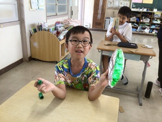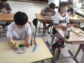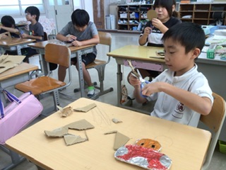 やまもも ステンドアルミづくり(10月1日) 公開日 2025/10/02 更新日 2025/10/02 各学年から 図工の時間です。ダンボールを好きな形に切り取り、少しだけ切り込みを入れます。その切り込みに毛糸を巻き付けてからアルミホイルで包み、色をつけていきます。 キラキラと輝く、素敵なオブジェができあがっています。 特別支援学級