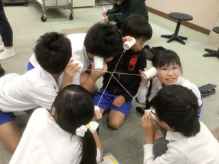 糸電話を使って、音の伝わり方についての実験をしています。糸の揺れをスパンコールで確かめたり、2人以上でも音が伝わるのか試してみたりしています。