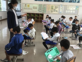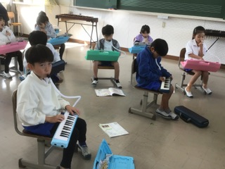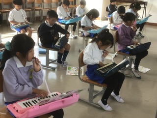 鍵盤ハーモニカを使って、演奏しています。みんな上手に弾けています。