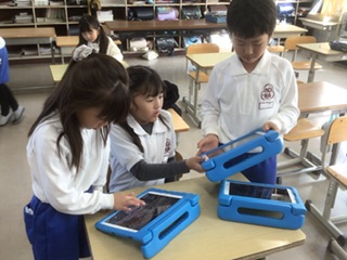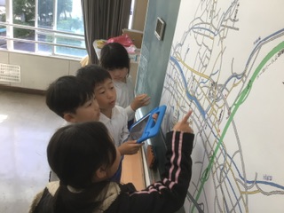 2年生 私の家は…(2組 10月29日) 公開日 2025/10/29 更新日 2025/10/29 各学年から 学区探検に向けて、自分の家が学区のどのあたりにあるのか、学習用タブレットで調べて模造紙の地図にシールを貼っています。家が近い子、とても遠い子、色々いるのが分かります。 2年