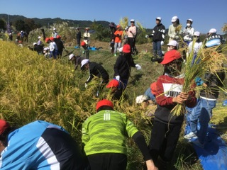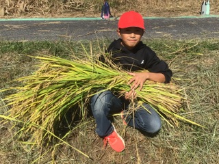 6年生 稲刈り(10月30日) 公開日 2025/10/30 更新日 2025/10/30 各学年から 無門学園のスタッフの方に鎌で稲を刈り取る方法を聞いて、いよいよ開始です。なかなかうまくできない子もいれば、家でお手伝いをしているのか、手際よく刈り取っている子もいます。秋晴れの空の下、時間内にたくさんの稲を刈ることができました。 6年 特別支援学級