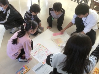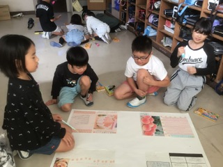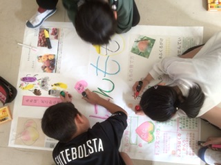 それぞれが桃についてまとめたものを模造紙に貼って、新聞を仕上げています。