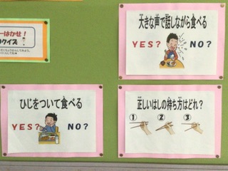 よいマナーは(食育コーナー 10月31日) 公開日 2025/10/31 更新日 2025/10/31 お知らせ よいマナーは一生の宝物です。食育コーナーでは、マナー博士になるためのYES.NOクイズが掲示されています。もう挑戦したでしょうか。 特色ある活動