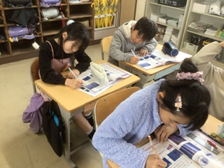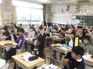 教科書の振り返りを使って、学んだことを確認しています。挙手も多く、集中しています。