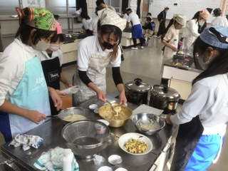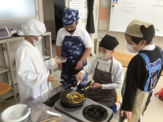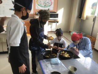 6年生 サツマイモを使って(1組 11月12日) 公開日 2025/11/12 更新日 2025/11/12 各学年から 2組に続いて、1組も実習です。メニューは大学いも、蒸しパン、スイートポテトなどです。美味しそうな匂いが漂っています。 6年 特別支援学級