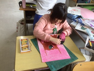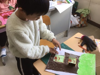 図工の授業です。画用紙に描いた絵に、カッターを使って窓を作ります。さて、窓からどんな景色が見えるのでしょうか。