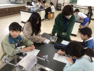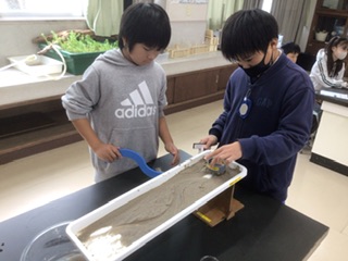 実験器具を使って曲がった川道を作り、水が流れた後に地形がどのように変化するのか確かめています。気づいたことはプリントに書き込んでいます。
