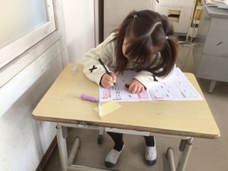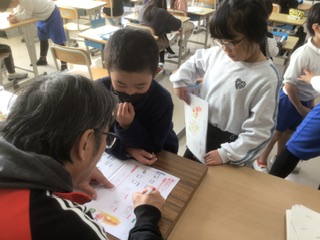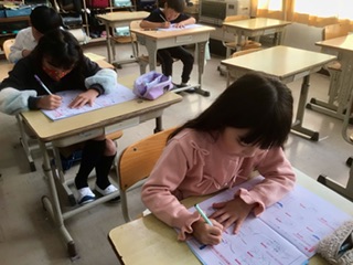 2年生 書き方(2組 11月17日) 公開日 2025/11/17 更新日 2025/11/17 各学年から 一人ひとり、集中して練習しています。書き上げたら担任の先生に見てもらいます。「この部分は少し線をカーブさせてね」「上手に書けましたね。」と、ことばをかけられています。 2年