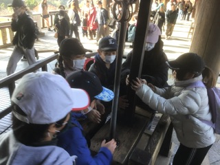 6年生 清水寺 公開日 2025/11/27 更新日 2025/11/27 各学年から 弁慶の錫杖を持ち上げるのに挑戦しました。清水の舞台の高さにもびっくりです。今から班に分かれて見学です。 6年 特別支援学級