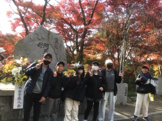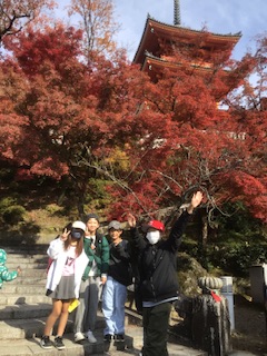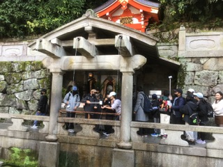 音羽の滝で水を飲んだり、紅葉を楽しんだりしています。とても良い天気です。