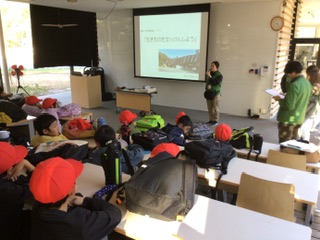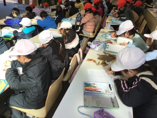自然観察の森に行きました。森に住む生き物や森のルールを学んでから、出発をしました。ムササビやイノシシの食べた葉っぱやドングリなど、生き物の痕跡を探しました。センターに戻ったあとは、観察記録カードを書きました。