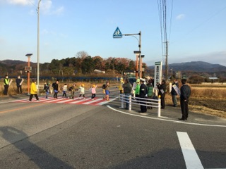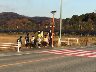 学校の西側、朝夕出勤の車が多い道路(中切金山線)を横断して登下校する通学班があります。今月、学校や交通安全推進協議会の要望を受け、「ぴかっとわたるくん」が設置されました。歩行者がボタンを押すと、ぴかっとわたるくんが点滅し、信号のかわりに車両に歩行者がいることを知らせます。これでより安全に登下校ができそうです。