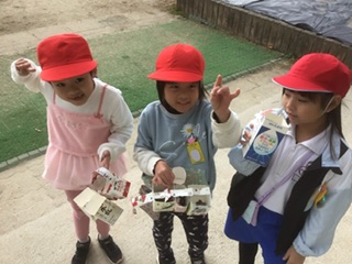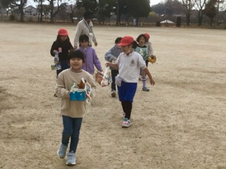 手作りの牛乳パックバックを持って、運動場で秋見つけをしました。どんぐり、紅葉、木の実などたくさんの秋を見つけて、バックの中に入れることができました。