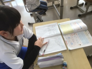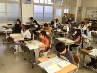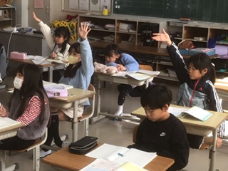 図形の中から三角形と四角形を見つけます。発言しようと、たくさん手もあがっています。