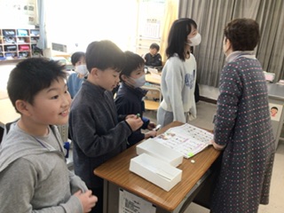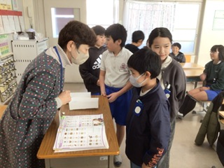 外国語の授業です。グループ対抗の復習すごろくに取り組んでいます。先生の質問に答えることができたら、サイコロを振ってコマを進めることができます。どのグループが1位でゴールできるでしょうか。