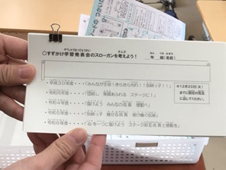 すずかけ発表会スローガン募集(12月17日) 公開日 2025/12/17 更新日 2025/12/17 学校行事 生活委員会が、朝の時間にそれぞれの学級にお知らせに行きました。どんなスローガンが集まってくるのか、楽しみです。 行事
