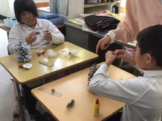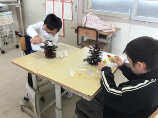 やまもも クリスマスツリー作り(12月17日) 公開日 2025/12/17 更新日 2025/12/17 各学年から 大王松の大きな松ぼっくりに、ビーズや綿などで飾りをつけていきます。松ぼっくりは茶色、白、黒、銀と色が分かれていたり、大きさが違ったりしていましたが、話し合って仲良く分けていました。素敵なツリーができあがりそうです。 特別支援学級