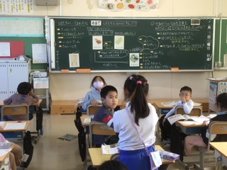 道徳の授業です。同じ日にある音楽会の練習会とお誕生日会。主人公のみそさざいはどちらに行ったのか、どうしてもそちらを選んだのかを話し合っています。黒板にはたくさんの意見が書かれています。