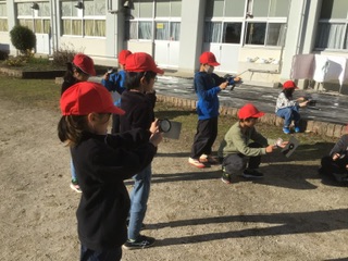 理科の授業です。虫めがねで日光を集めた時の、明るさやあたたかさについて調べています。