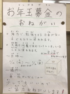 お年玉募金(JRC委員会 1月14日) 公開日 2026/01/14 更新日 2026/01/14 特別活動 14日(水)から16日(金)まで、JRC委員会の呼びかけでお年玉募金を行っています。集まったお金は、海外の人々の教育支援や国内の自然災害の復興支援に使われます。今日もたくさんの人が協力してくれていました。ありがとうございます。 委員会