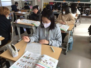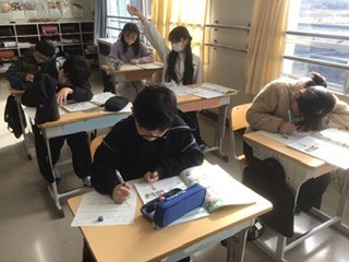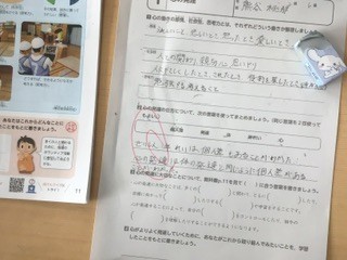 心の発達について学びました。嬉しい、悲しいといった感情、人との関わりの社会性、思考力などについても考えました。プリントのまとめには「人の発達には個人差がある」「年と心の発達は同じではないから、しっかり嬉しいことや悲しいことを体験することが大切」などと書き込まれていました。
